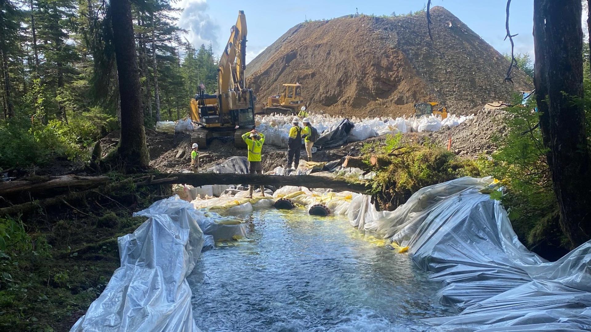 The purpose of this project, located on Latouche Island, was to temporarily divert flow of Copper Creek through a historic channel to circumvent the flow of water around Mine Lake. Our crew performed on-site assembly and installation of 1,500 feet of 20” – 24” HDPE pipe. Cruz also excavated 10 ft. deep trenches along the entire pipe alignment, filled and placed 3,000+ sand bags, and procured and installed an I beam for the bridge portion of the project. Cruz also provided camp facilities which included full amenities and camp maintenance/management.